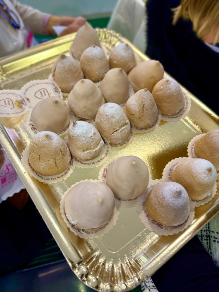 Podcast chatter | Pictured below, the tette delle monache (Nun’s Breast pastries), so named because of their shape, have the consistency of a sponge cake and are filled with crema pasticcera, politely rebranded as “Il Sospiro di Bisceglie”.